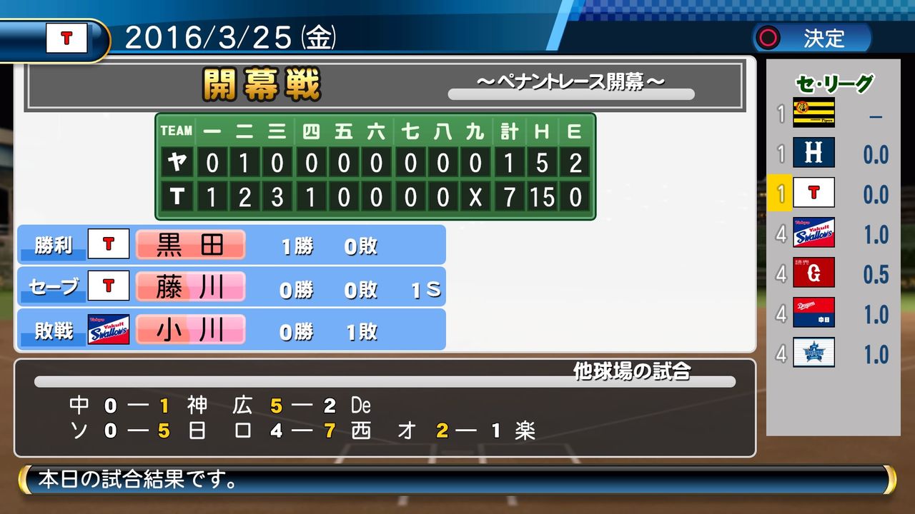 なぜか抑えとして登録してない球児が登板するハプニングがあったものの無事開幕戦勝利