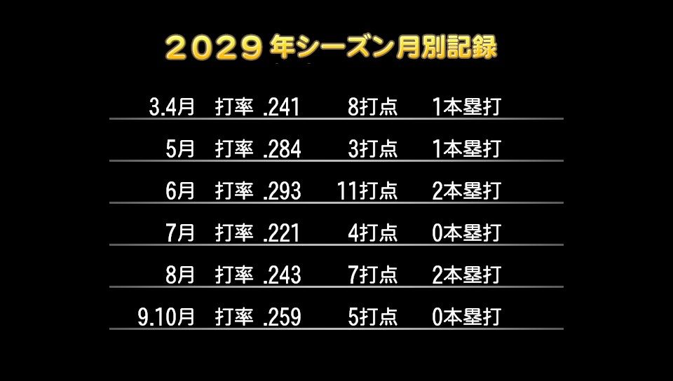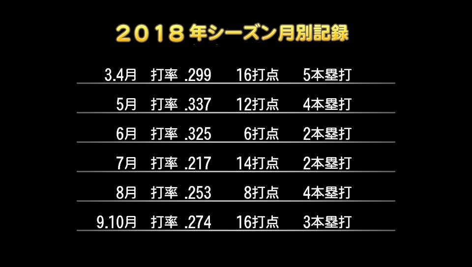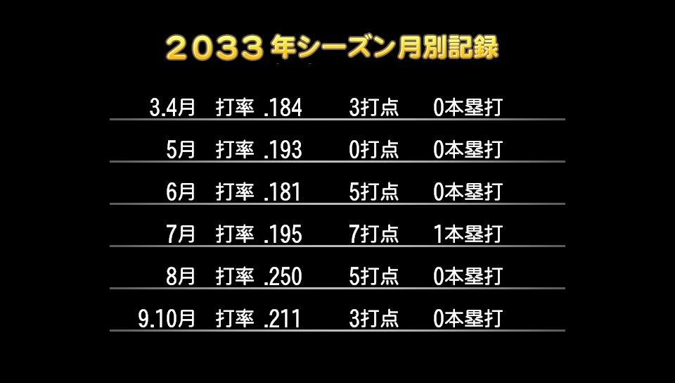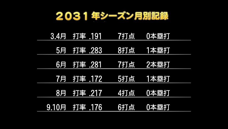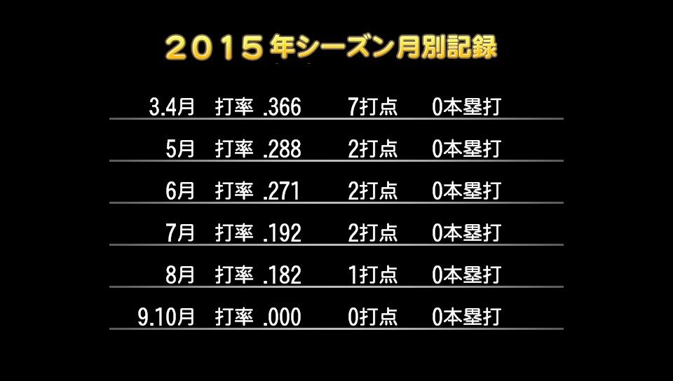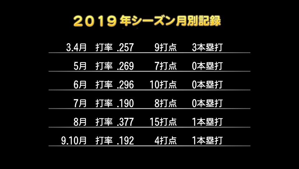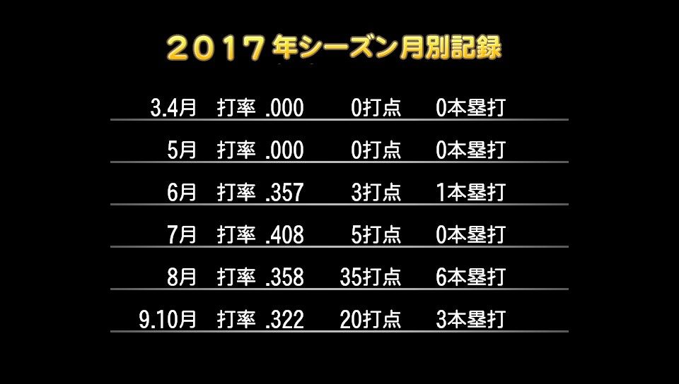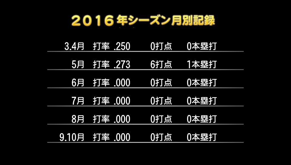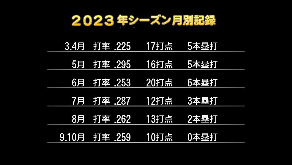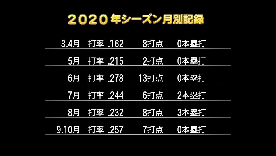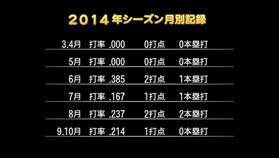 三振92 四球45 死球5 犠打11 出塁率.341 長打率.449 OPS.790