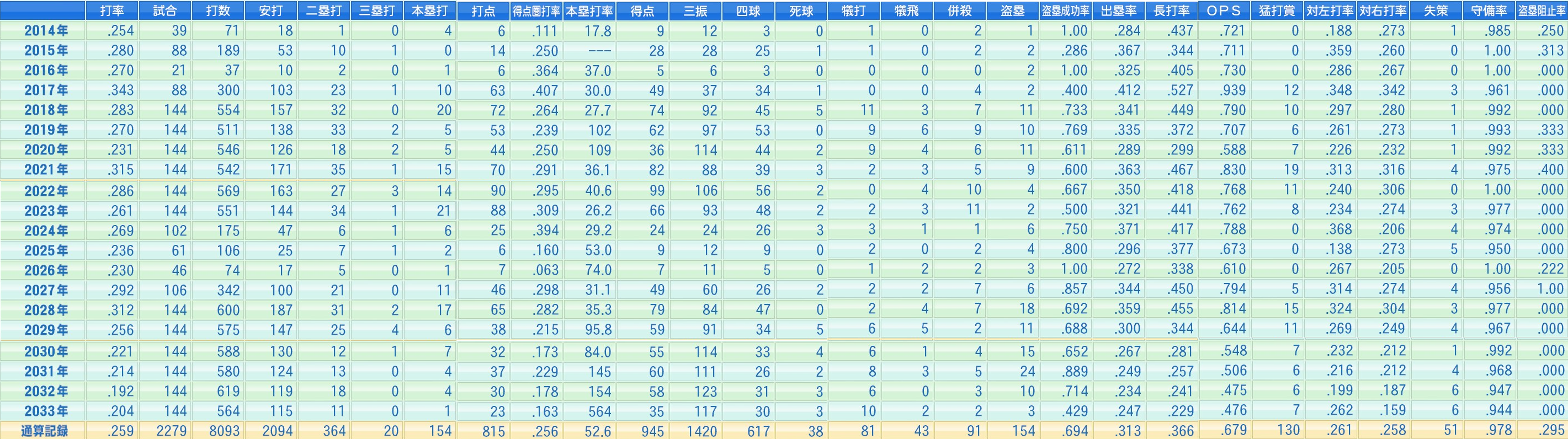 2279試合 .259(8093打数2094安打) 154本 815打点 得点圏.256 154盗塁(成功率.694)