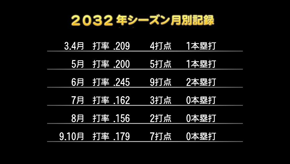 三振12 四球3 死球0 犠打1 出塁率.284 長打率.437 OPS.721