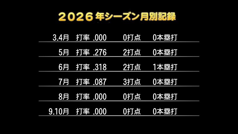 14試合 .250(32打数8安打) 0本 0打点 0盗塁 OPS.595