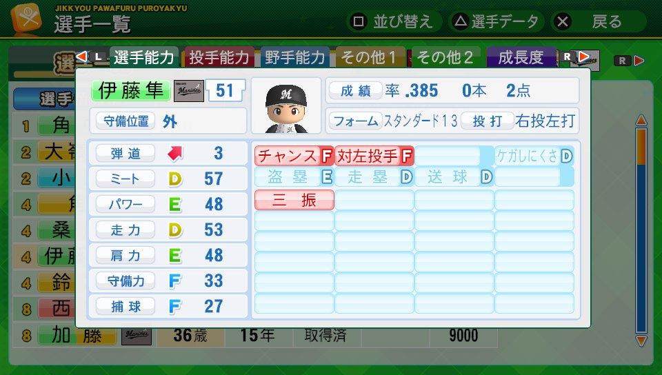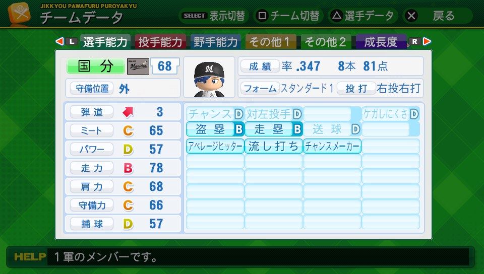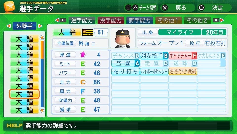 弾4EEBEDE チャンスC 盗塁A 対左C キャッチャーF ケガE 粘り打ち ハイボールヒッター ささやき戦術