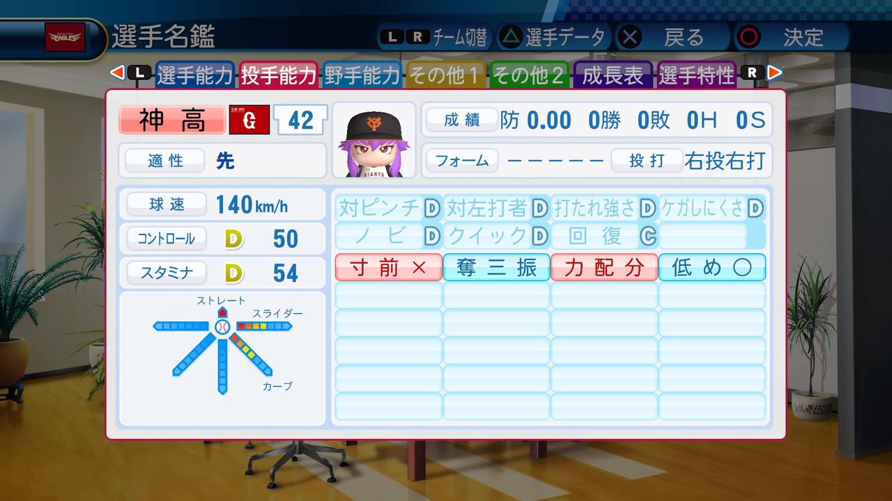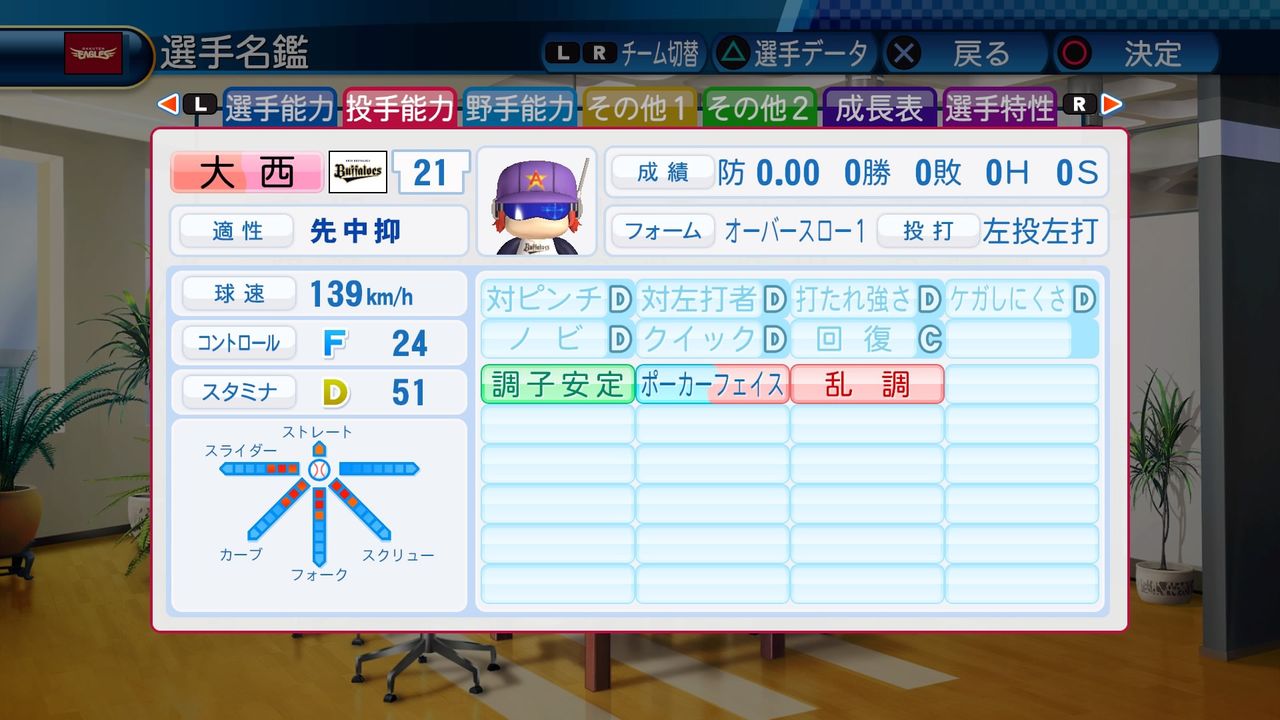 球速139km/h コンF24 スタD51 スライダー3 カーブ3 フォーク3 スクリュー3