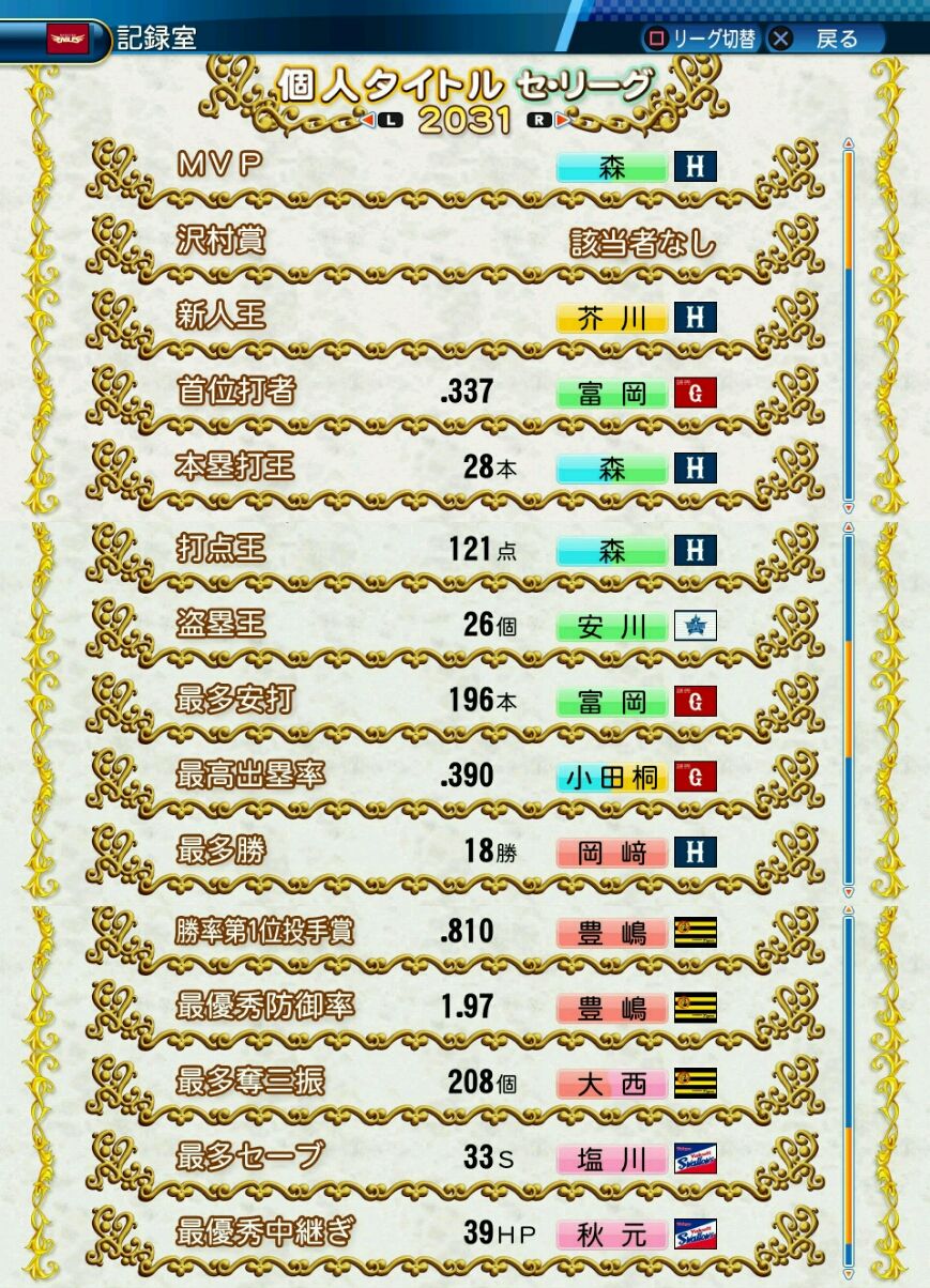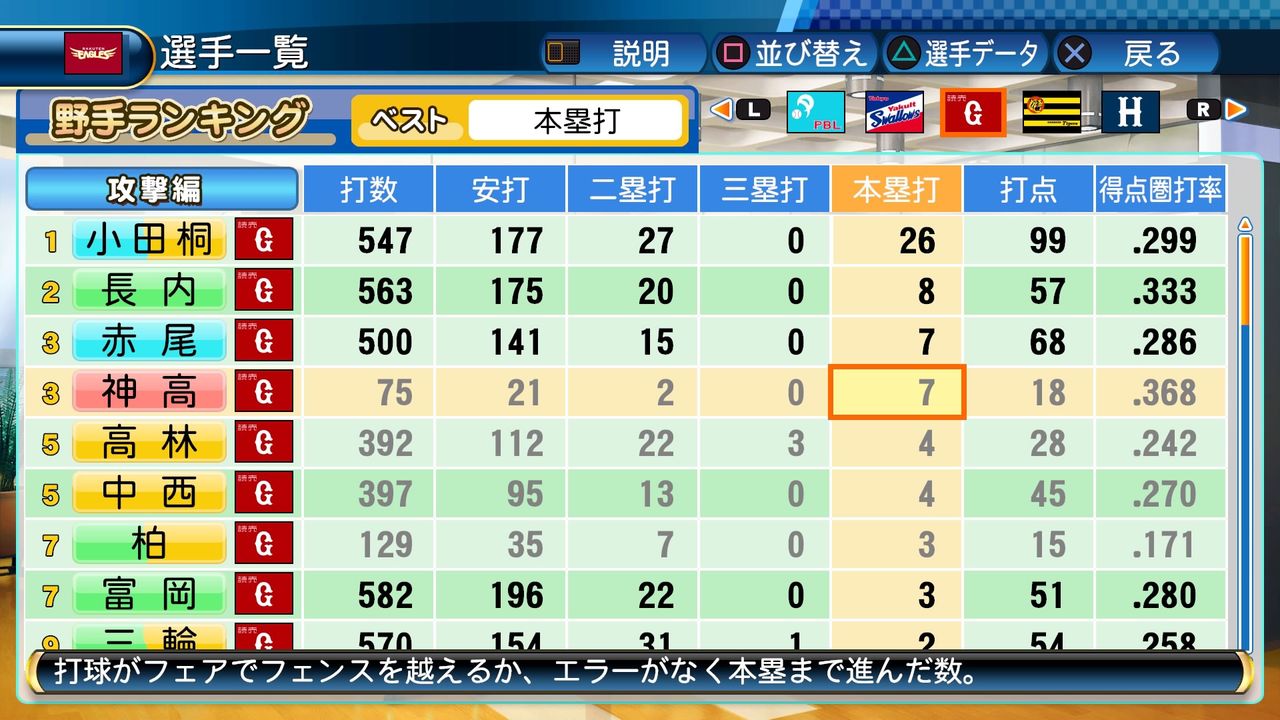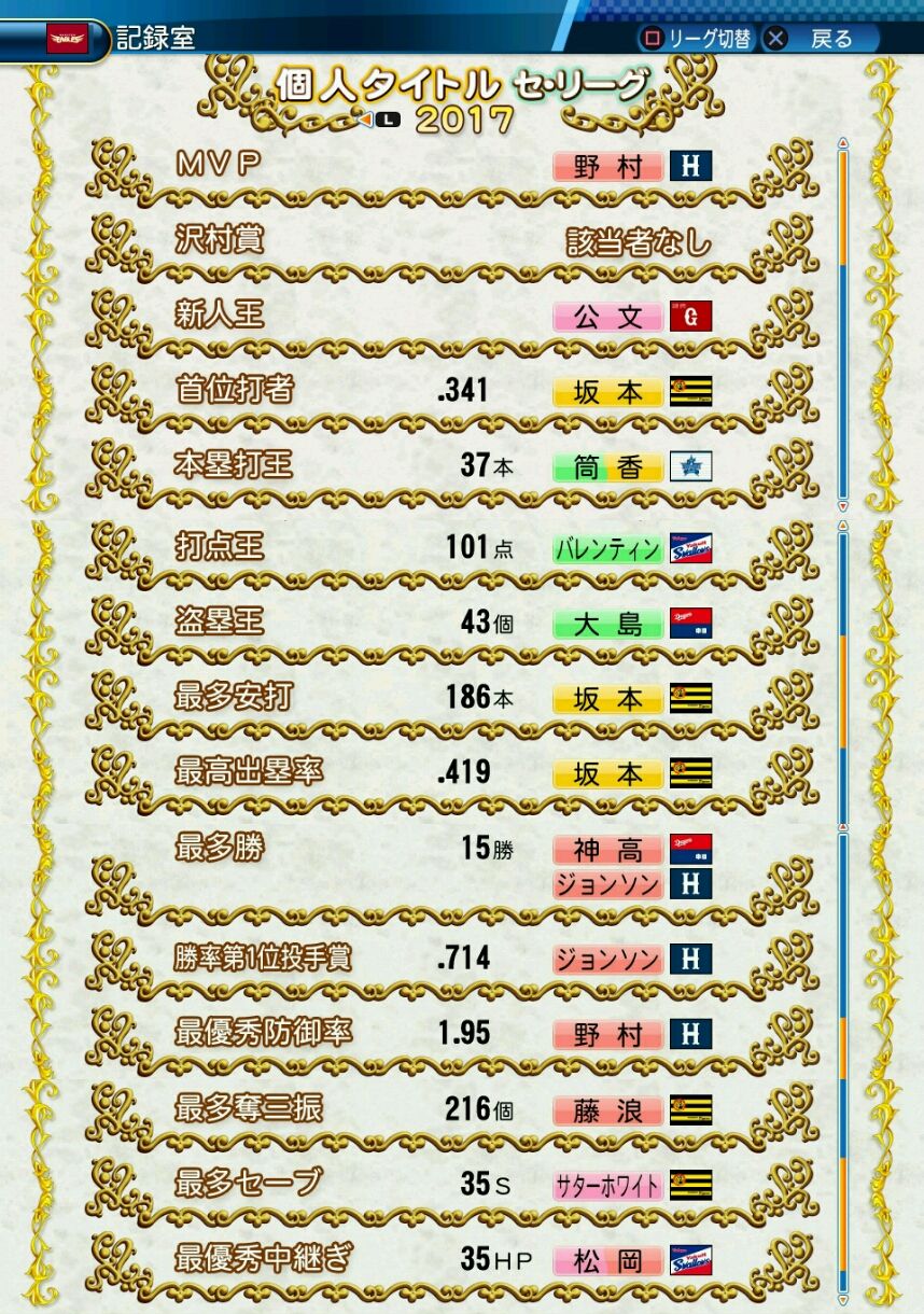 得点圏打率.262(237打数62安打) 得点151 三振169(率.166) 四球117 死球2 犠打0 犠飛5