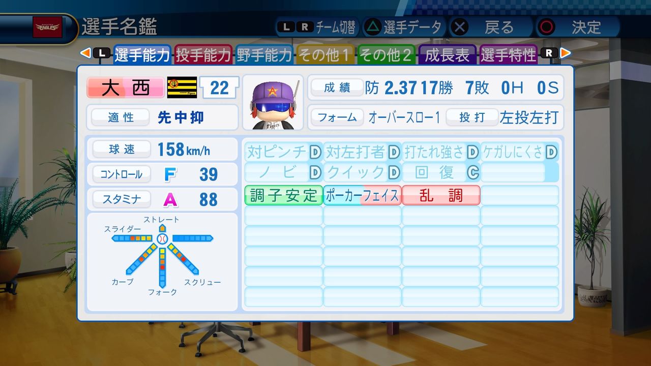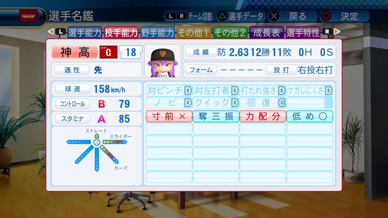 球速152km/h コンF25 スタA85 スライダー4 カーブ4 フォーク4 スクリュー4