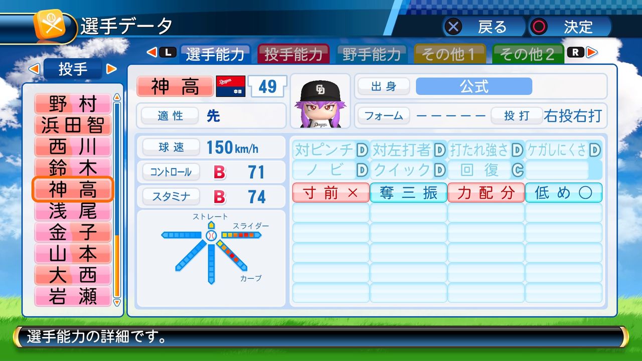 球速150km/h コンB71 スタB74 スライダー6 カーブ5