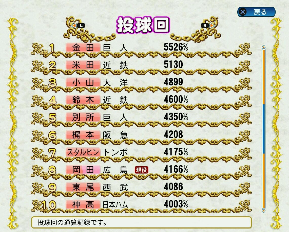 546登板3956回2/3 3.01 勝率.566 235勝180敗4HP1S 完投179 完封54 QS373回(率72.6) HQS256回(率49.8)