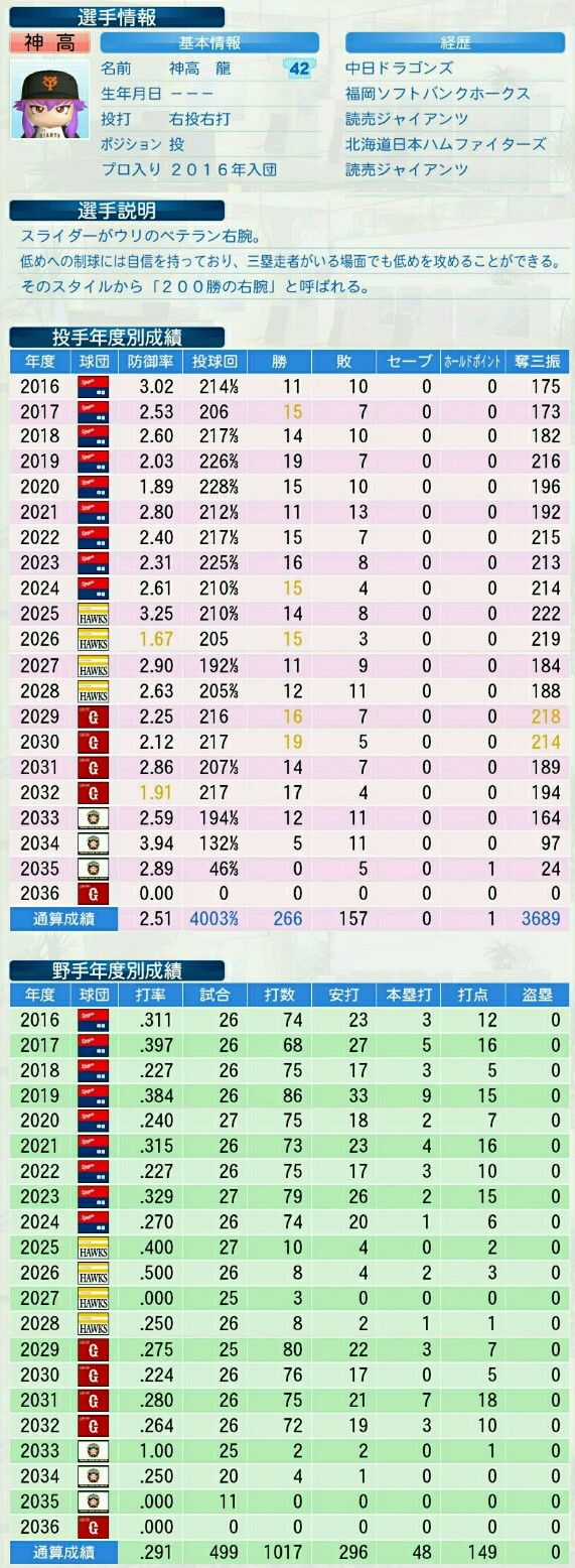 499登板4003回2/3 2.51 勝率.629 266勝157敗1HP 完投264 完封63 QS375回(率75.9) HQS284回(率57.5)