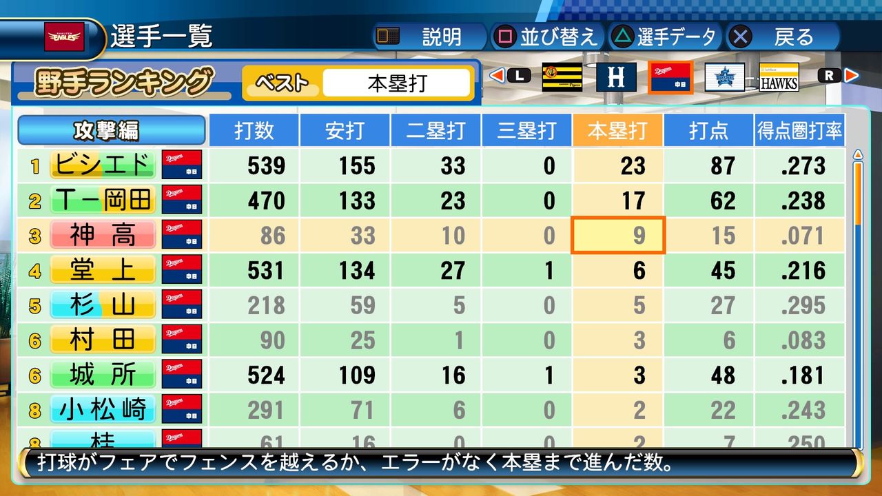 得点圏打率.200(239打数48安打) 得点74 三振237(率.229) 四球43 死球5 犠打46 犠飛9