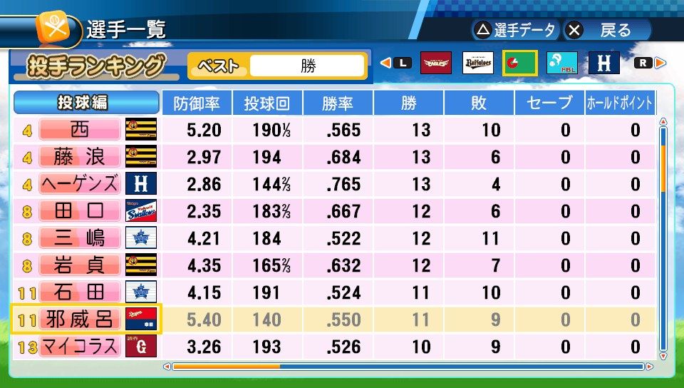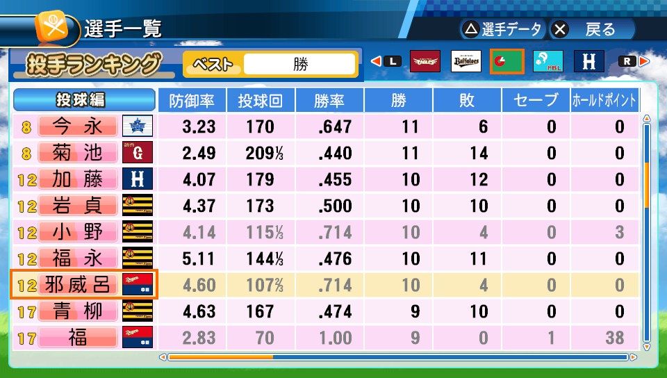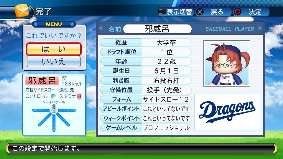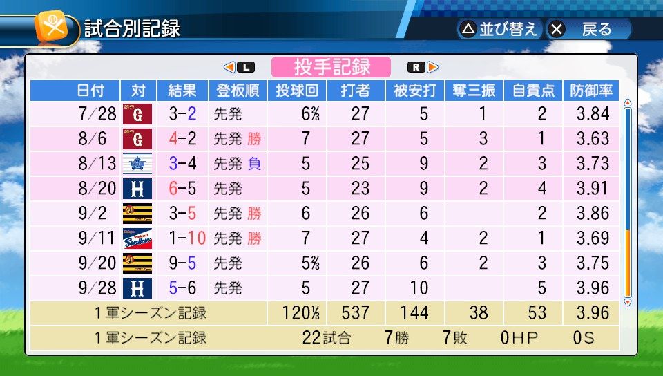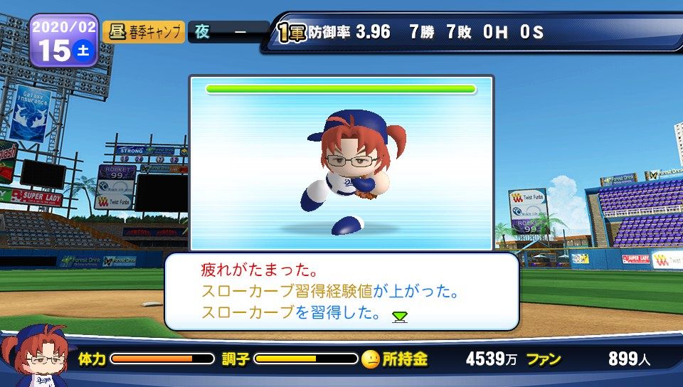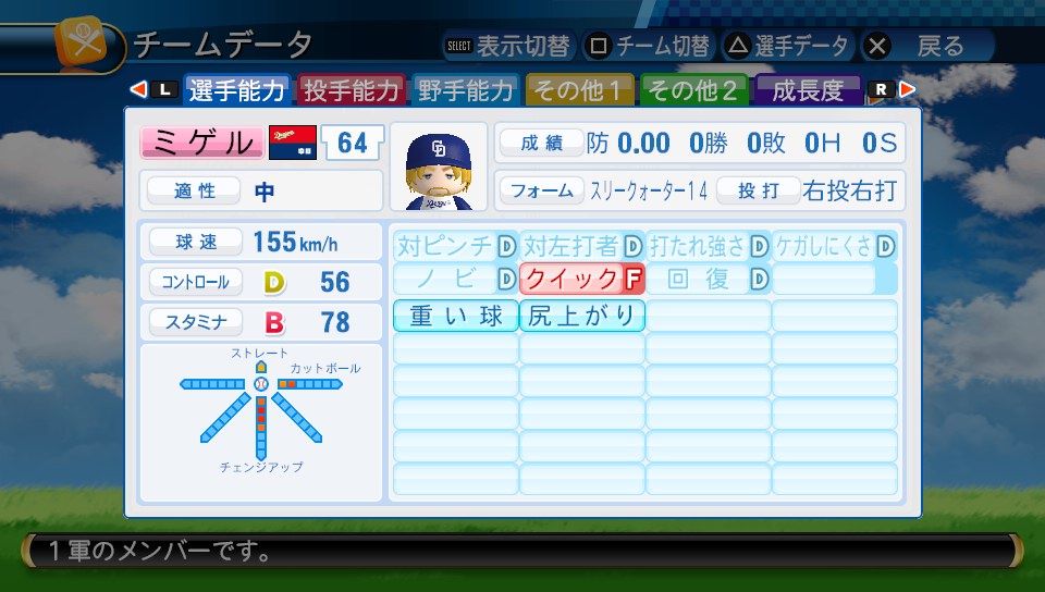 球速123km/h コF39 スS96 ジャイロボール スローカーブ2 怪童 回復C 本塁打厳禁 寸前× 勝ち運 短気 乱調 変幻自在