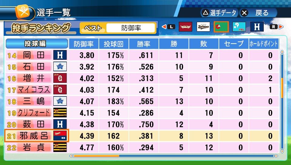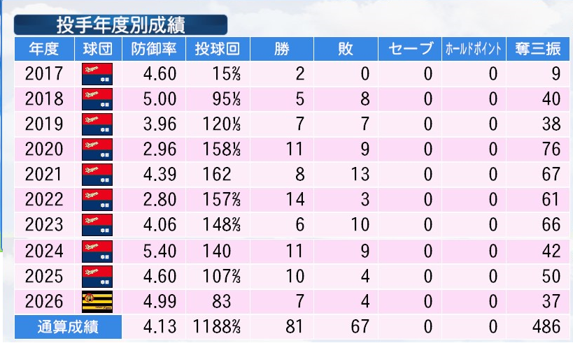 25登板 148回2/3 防4.06 勝率.375 6勝10敗 奪三振66 完封0 完投0