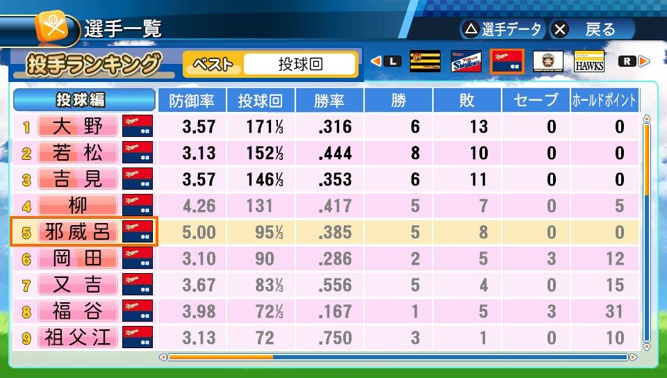 球速123km/h コF32 スB76 ジャイロボール 対ピンチF 怪童 本塁打厳禁 寸前× 短気 乱調 変幻自在