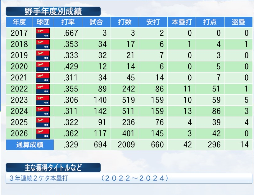 91試合 .322(236打数76安打) 4本 39打点 4盗塁 OPS.834