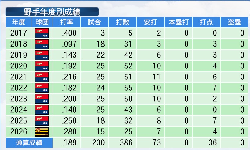 .189(387打数73安打) 0本 36打点 0盗塁 OPS.413