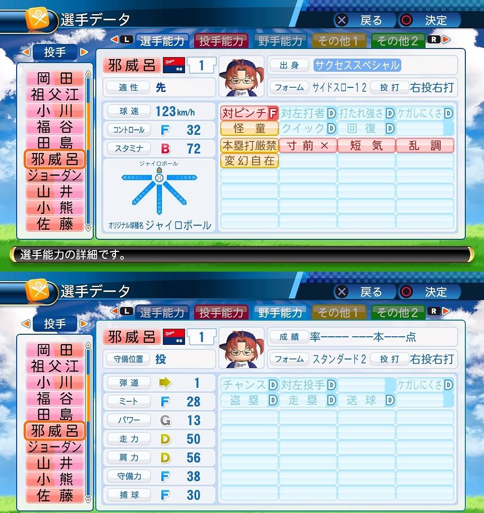 球速123km/h コF32 スA83 ジャイロボール スローカーブ2 怪童 本塁打厳禁 寸前× 短気 乱調 変幻自在