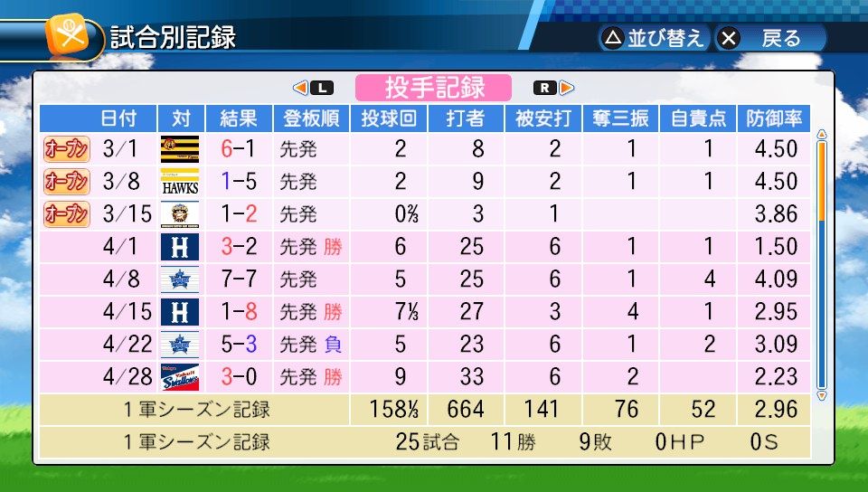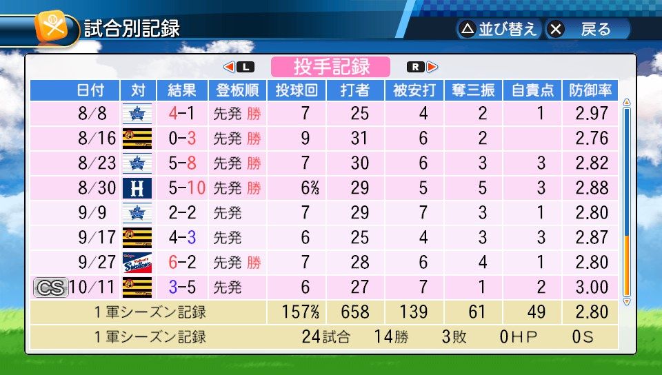 25登板 158回1/3 防2.96 勝率.550 11勝9敗 奪三振76 完封2 完投2