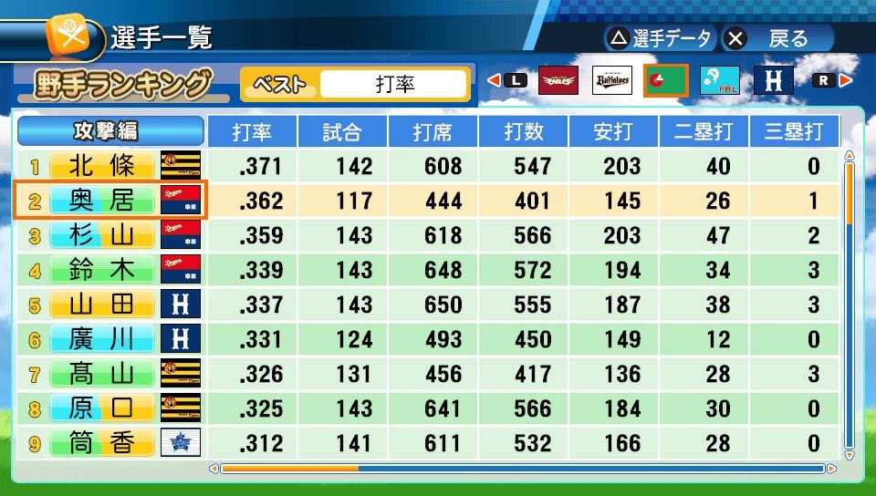 奥居 弾2BCCCCB チャンスB キャッチャーE 送球C 粘り打ち 初球○ チャンスメーカー 逆境○