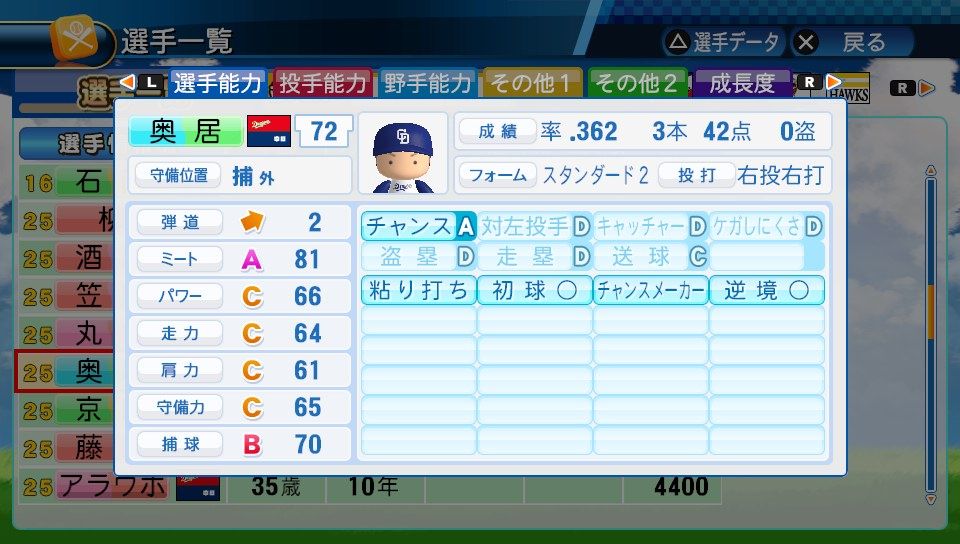 奥居 弾2BCCCCB チャンスC キャッチャーE 送球C 粘り打ち 初球○ チャンスメーカー 逆境○