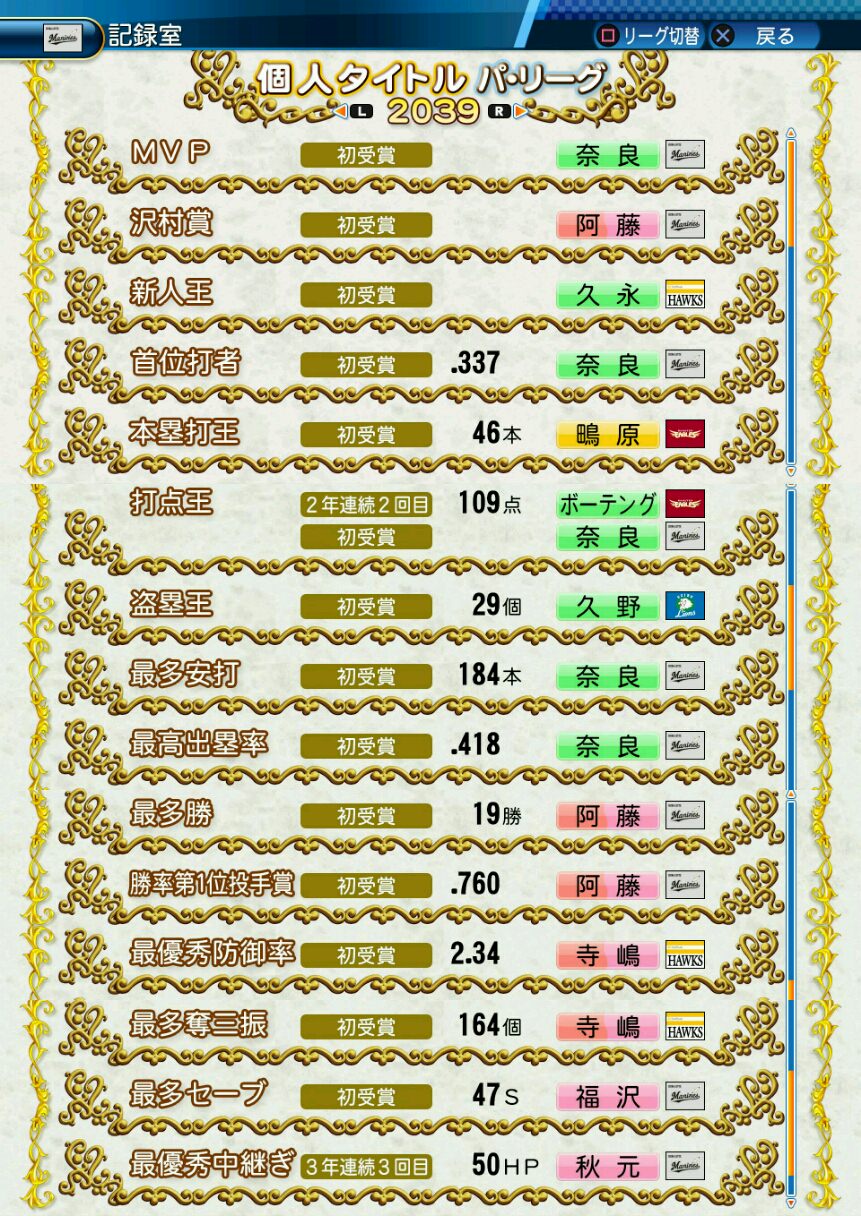 ベストナイン 3回(2029、2030、2036)