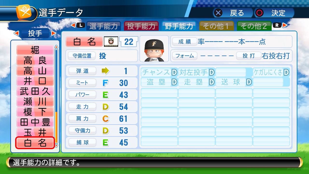 ノビB 回復C キレ○ 重い球 闘志 対強打者○