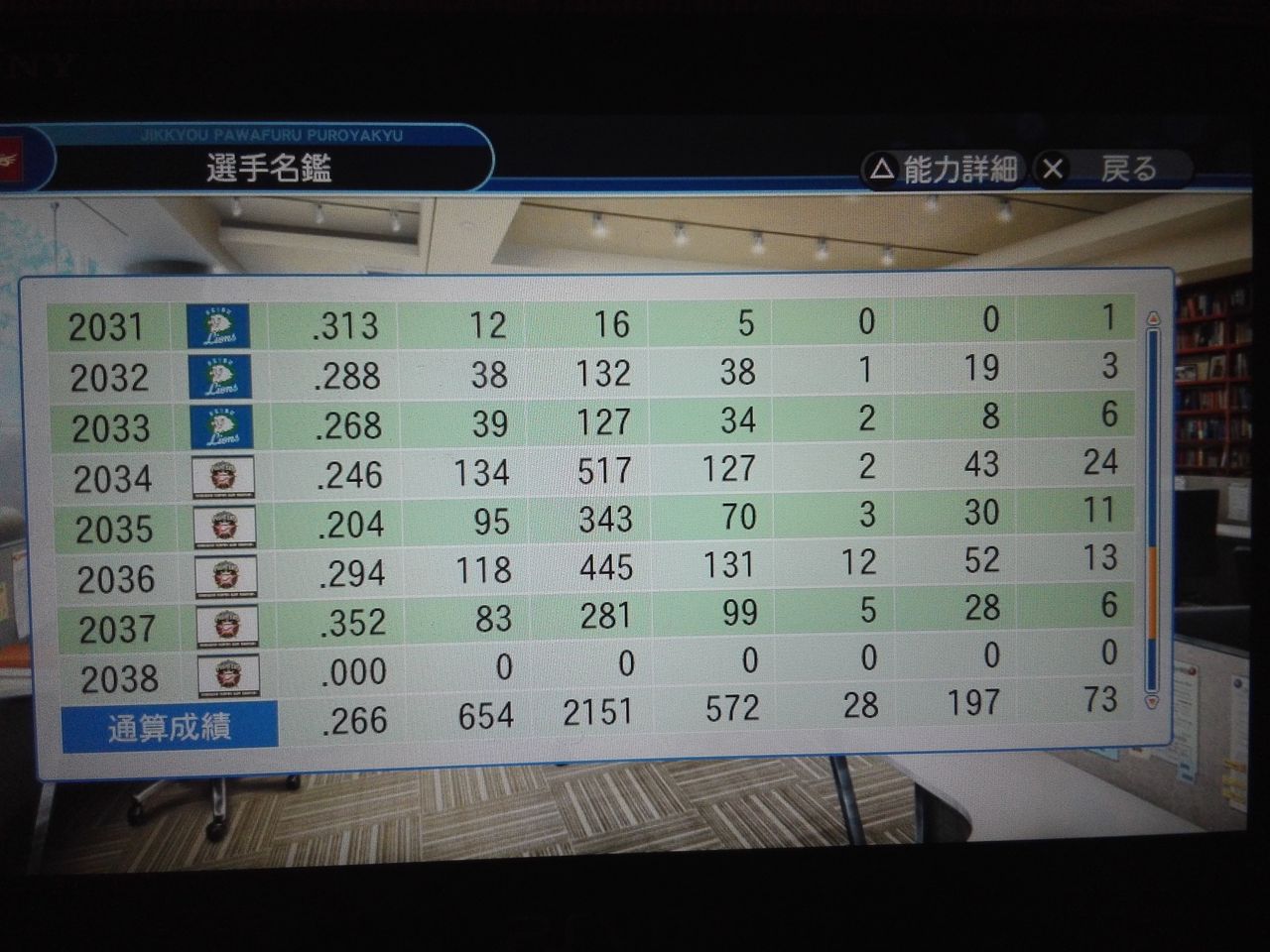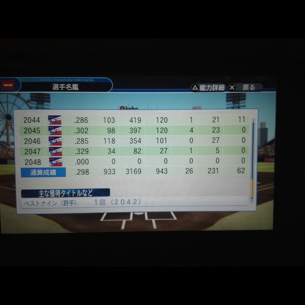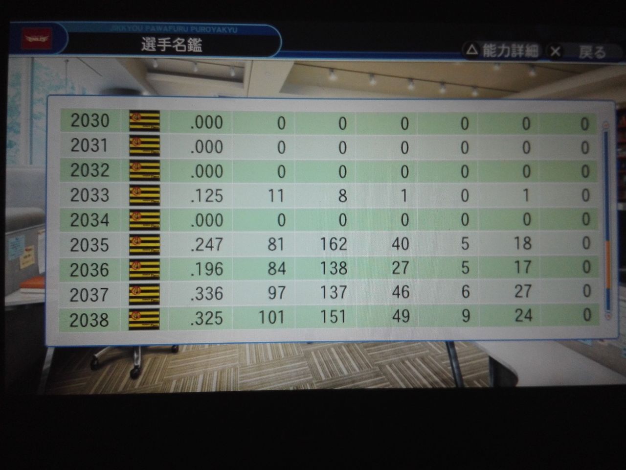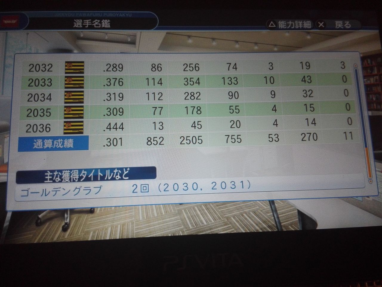 32歳の2034年には.303 43本 124点 3盗の成績で本塁打王、打点王の2冠を獲る そして2037年、メジャーへ